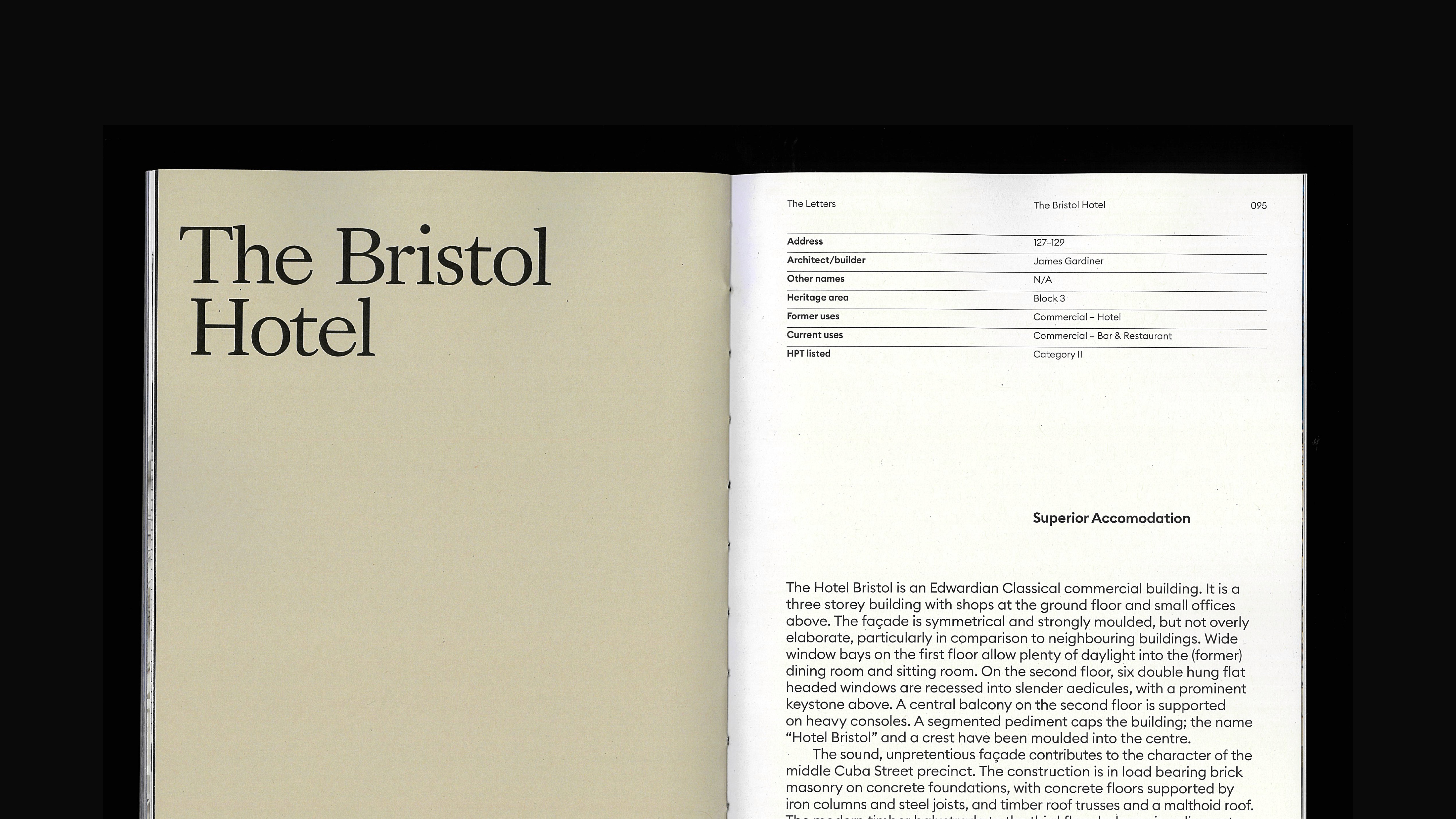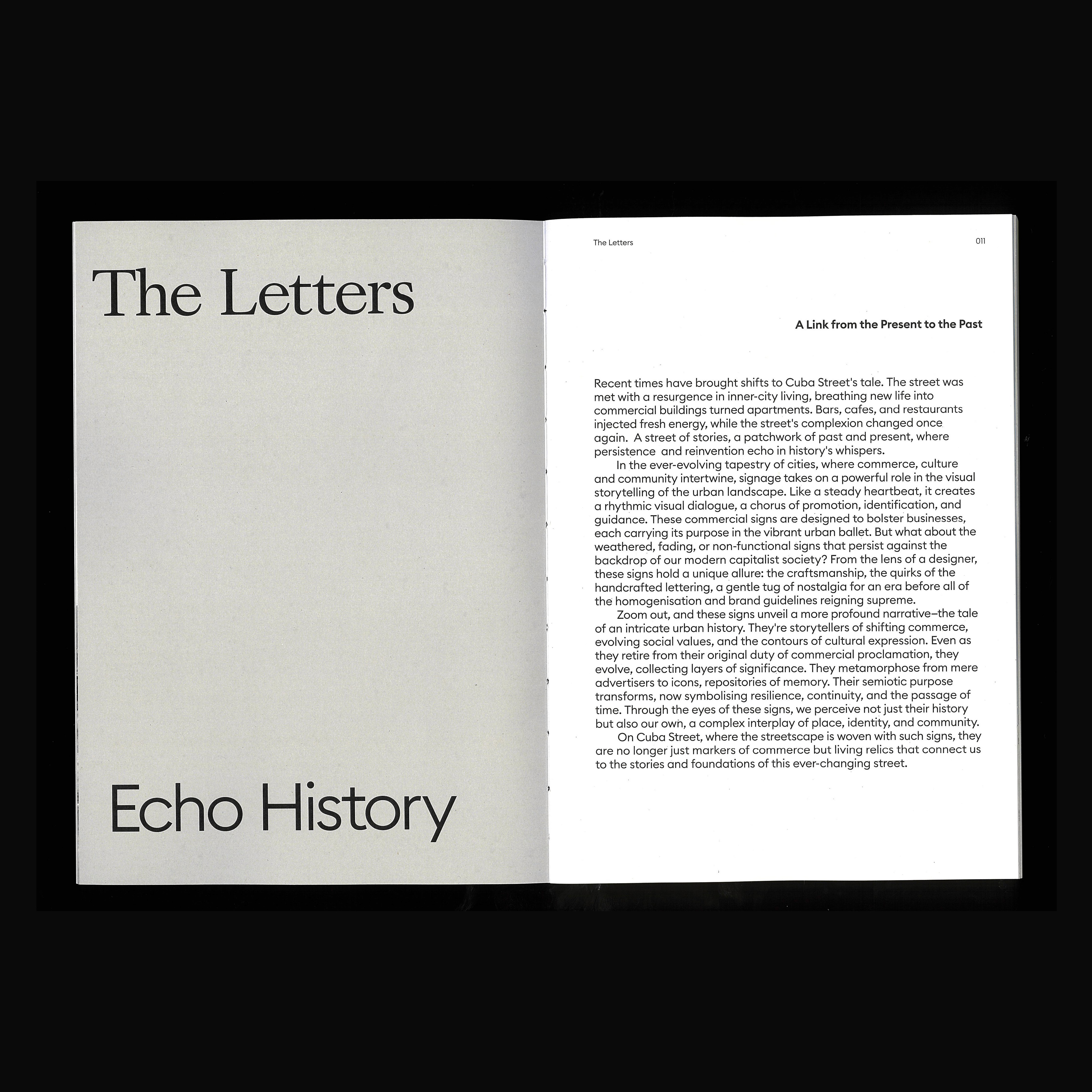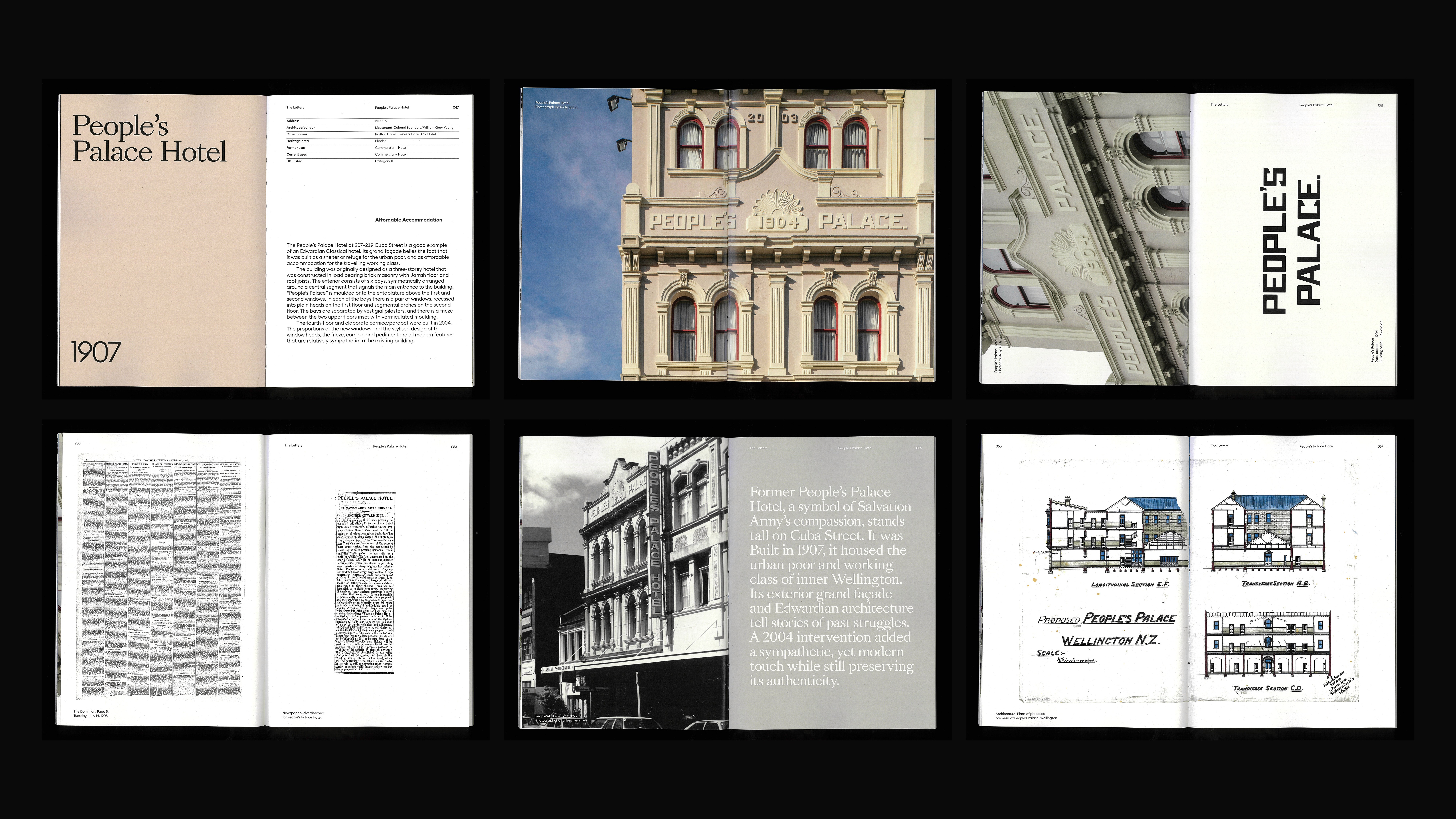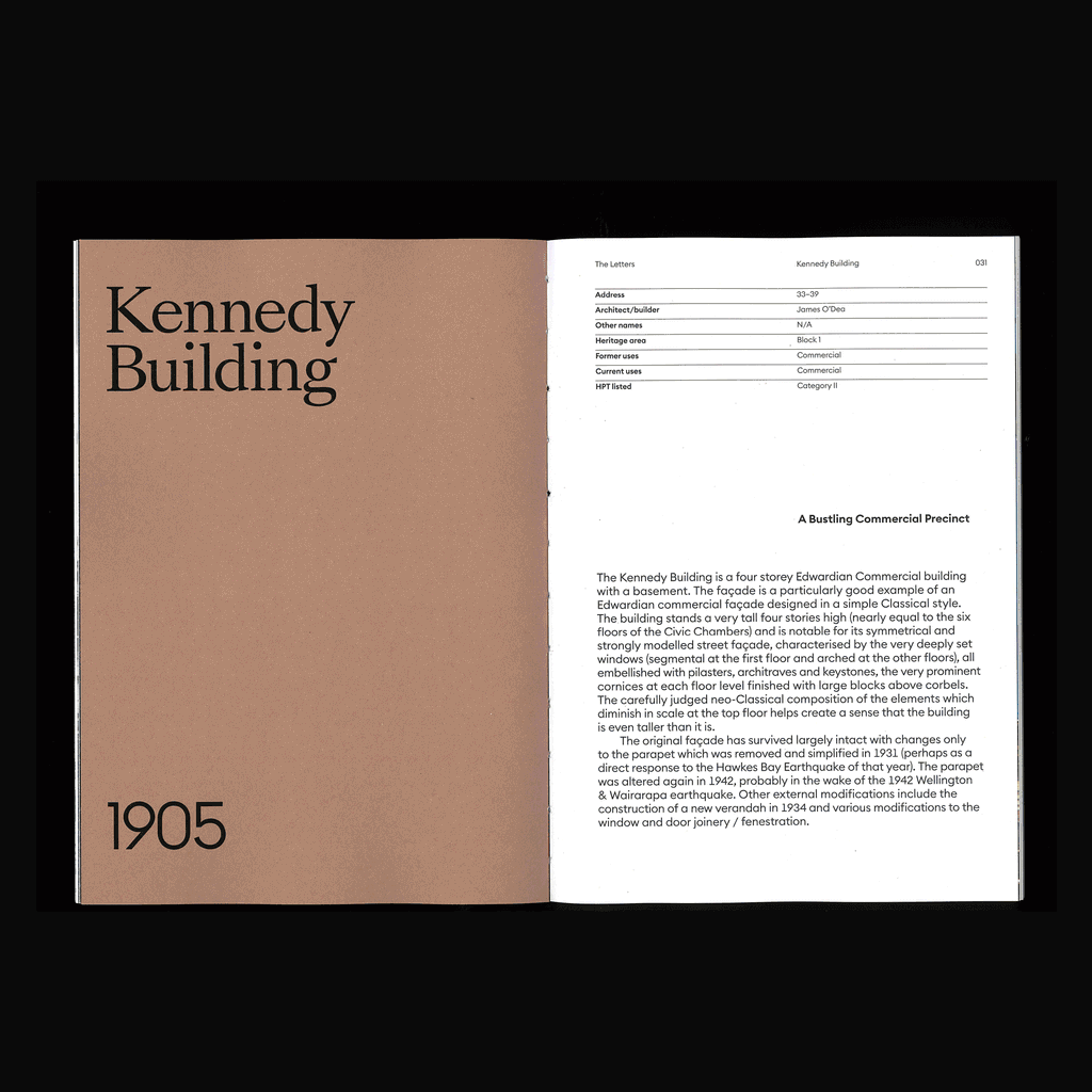 The final outcome is a 220-page publication created in collaboration with an architectural photographer. Detailed documentation of each building is paired with archival material and typographic studies, creating an immersive visual record of Cuba Street’s shifting identity.
