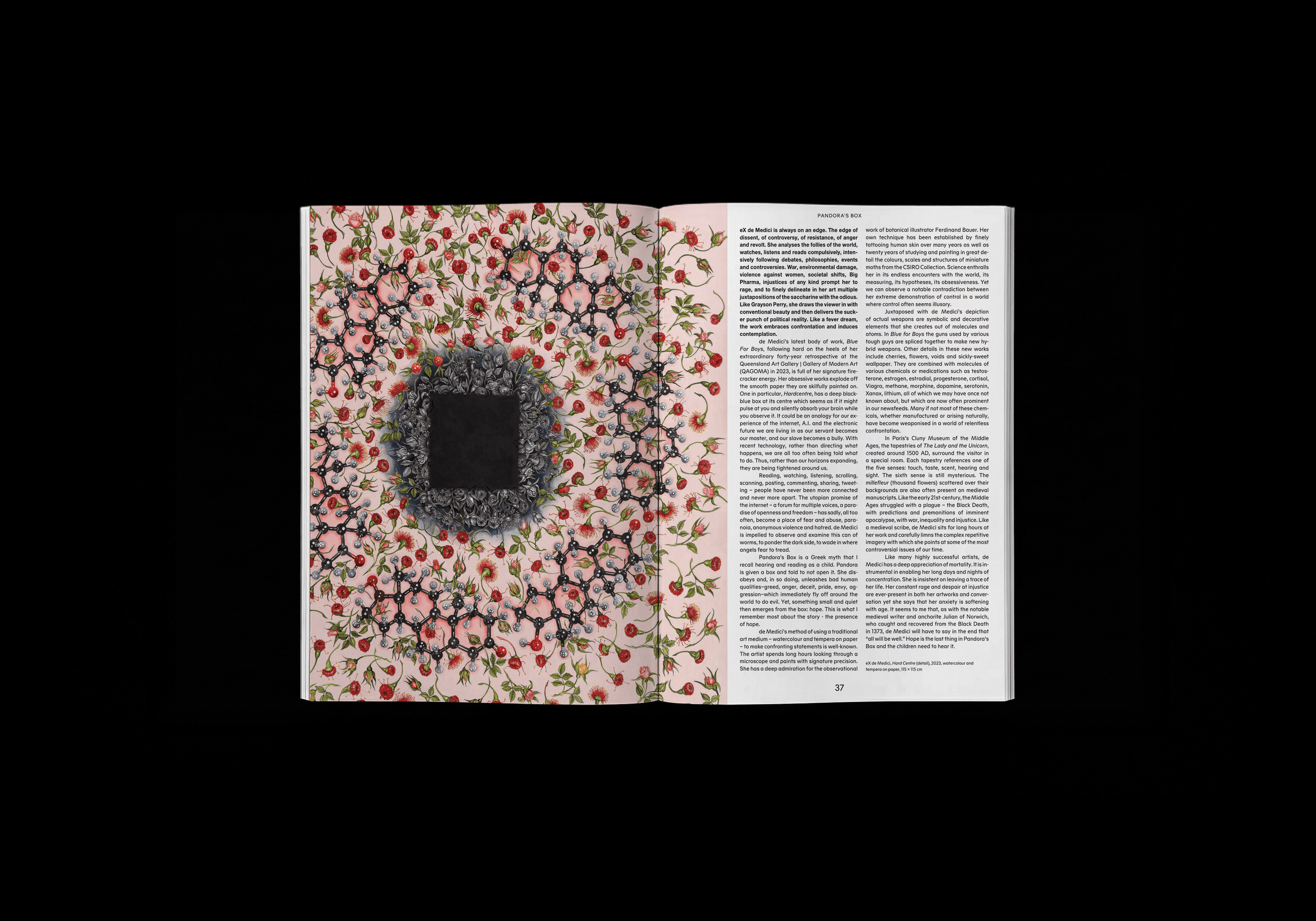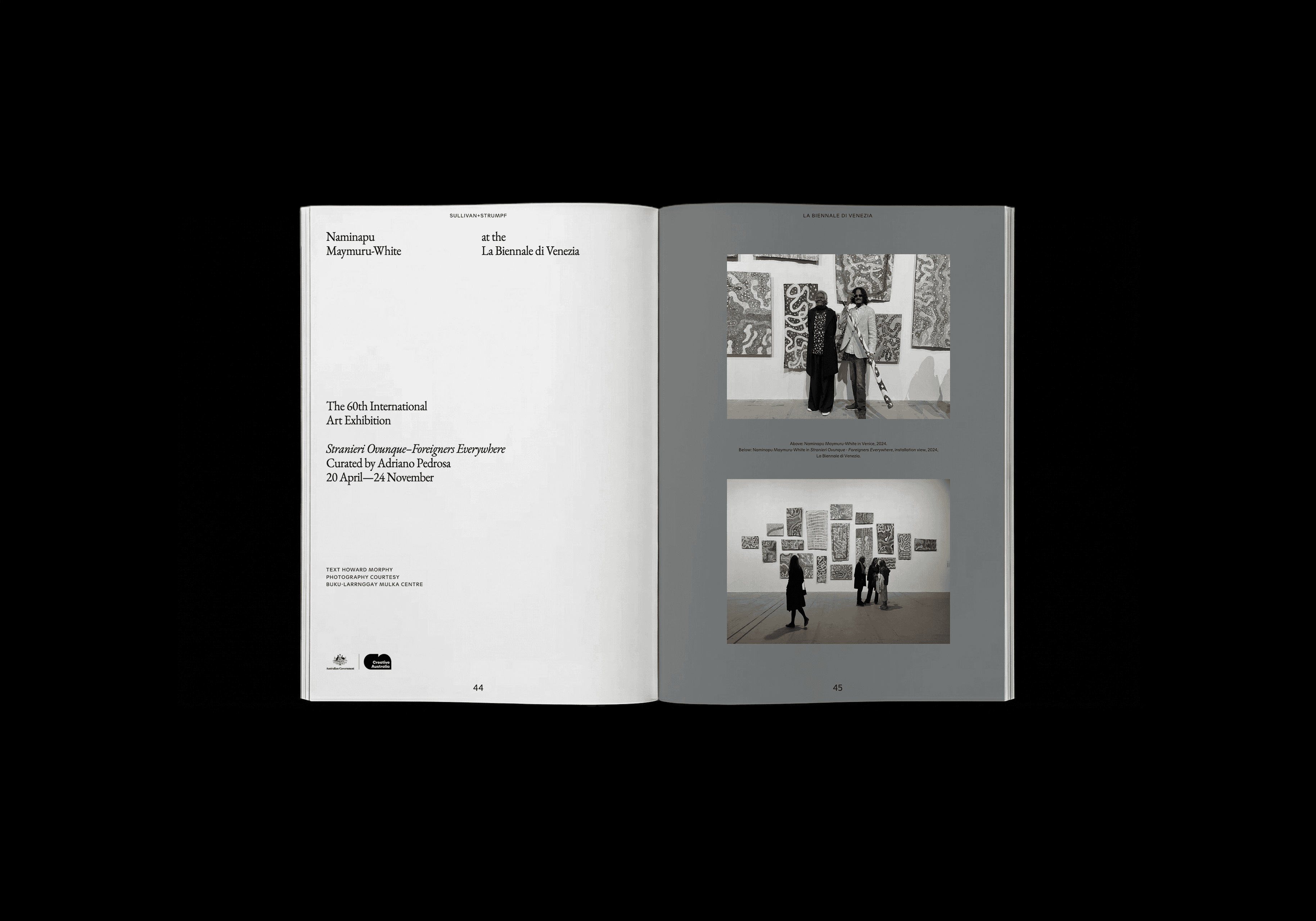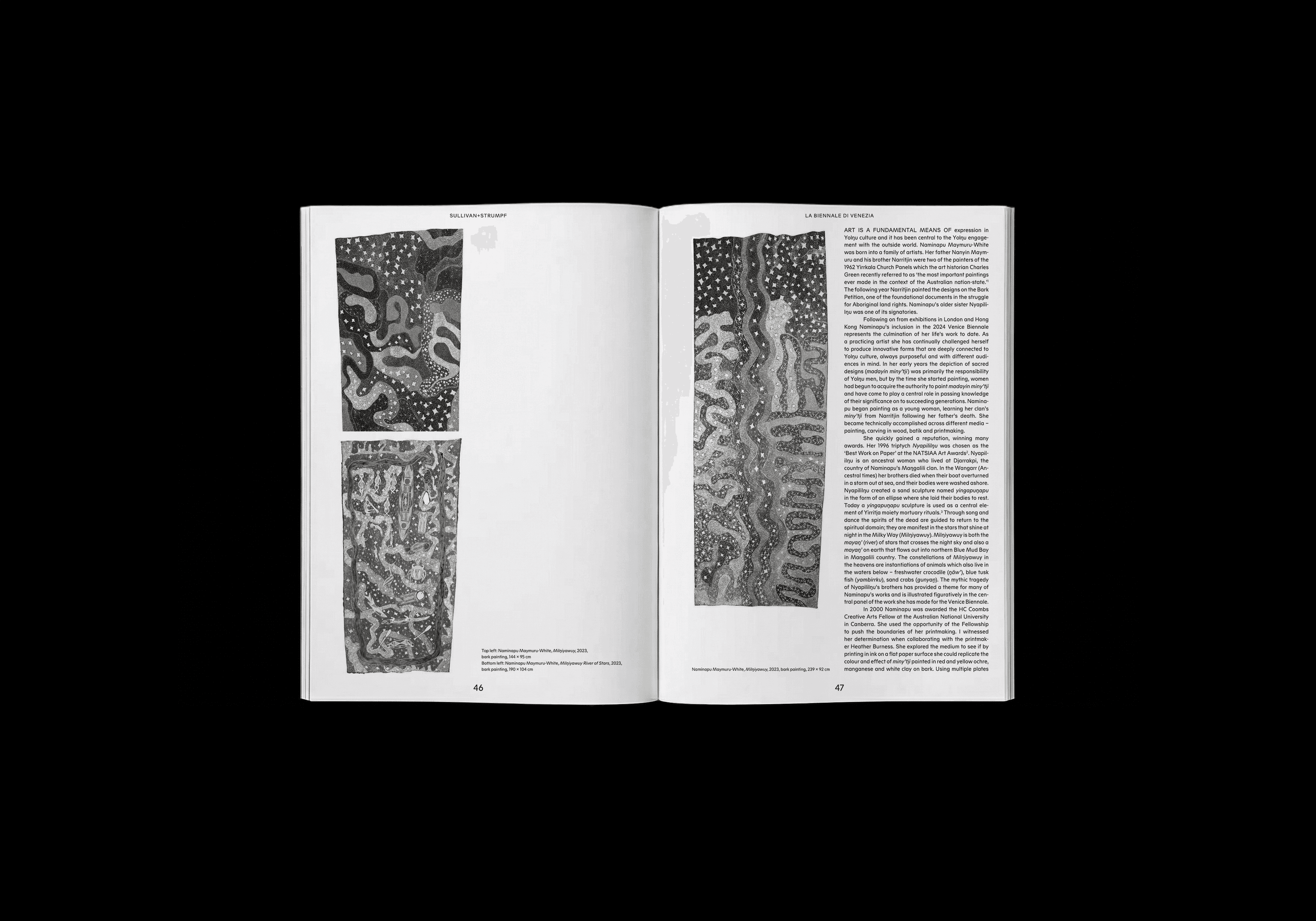 The design language is deliberately restrained. Generous margins and a consistent grid create structure and breathing room, allowing full-bleed works and large-scale imagery to hold presence without competition. Typography is clean and measured, introducing clarity and authority while remaining secondary to the art.