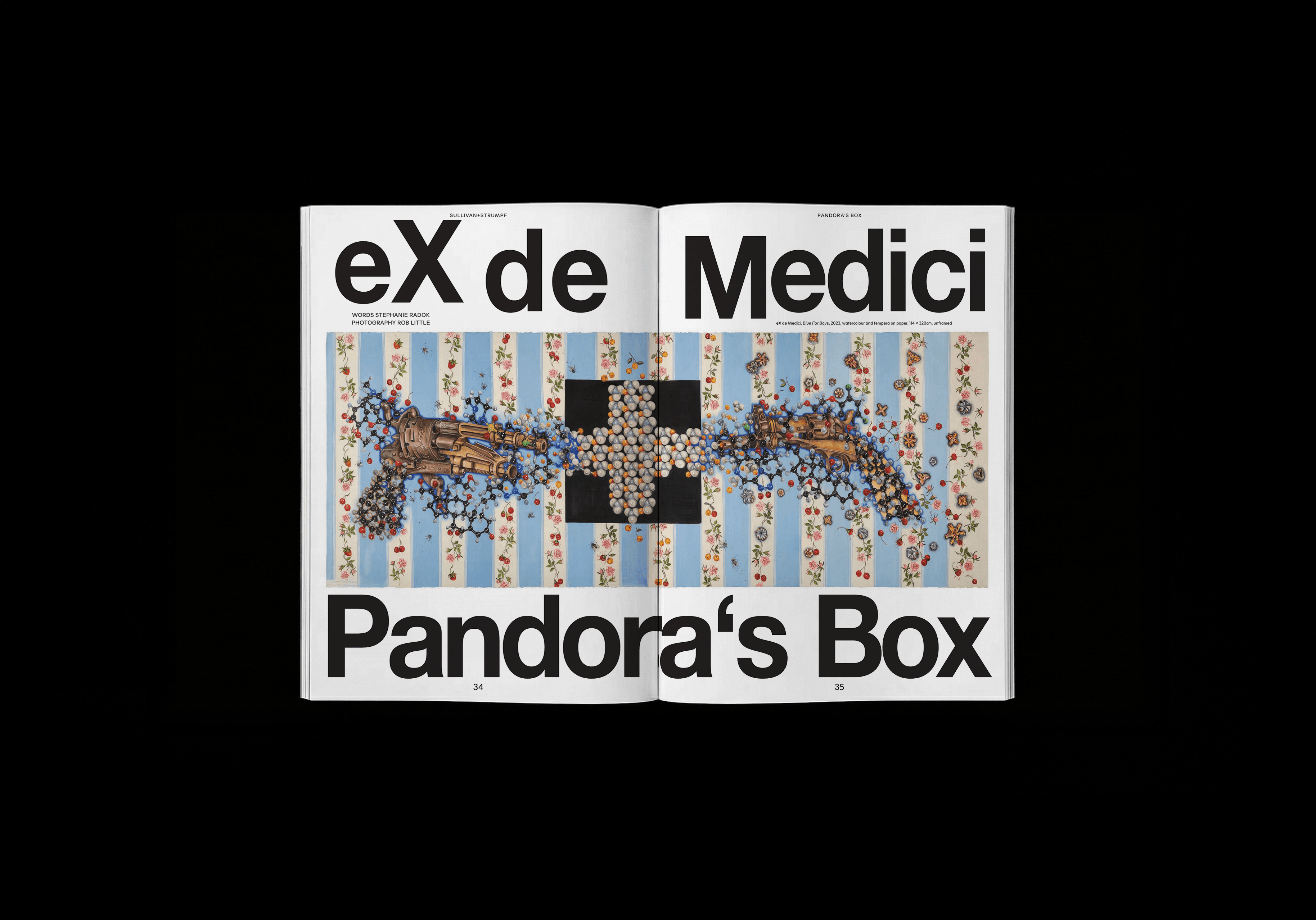 Moments of contrast are introduced strategically. Section openers shift scale and colour, creating rhythm across the issue and signalling transitions between artists. These gestures are controlled rather than expressive, reinforcing the gallery’s contemporary voice without overwhelming the content.